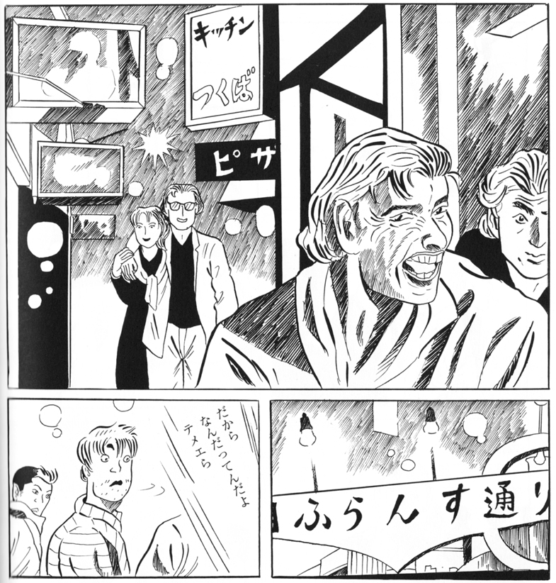 つげ忠男の描く夜の街。この突き放したような殺風景な情緒を見よ。1960~70年代に「ガロ」で名作「無頼の街」などを連載していたころから、本質的にはまったく変わっていない。この裏寂れた下層の情景がたまらない。今回の作品「変転」にはエリート層らしき銀行マンが登場するが、エスタブリッシュな階層がまるで感じられず、ジーパン屋の亭主にしか見えない(笑)。