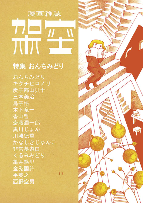 おんちみどり特集。現在自分が最も面白いと思っている漫画家のひとり。こんな愉快な絵でシュールなハナシが成立することじたいが愉快だ。よく純粋階段のようなものが画面に溢れていて、明らかに不思議な空間なのだが不安な感じがしない。時間の進み方もゆっくりしていて呑気なムードがたのしい。実は4コマ漫画が秀逸。